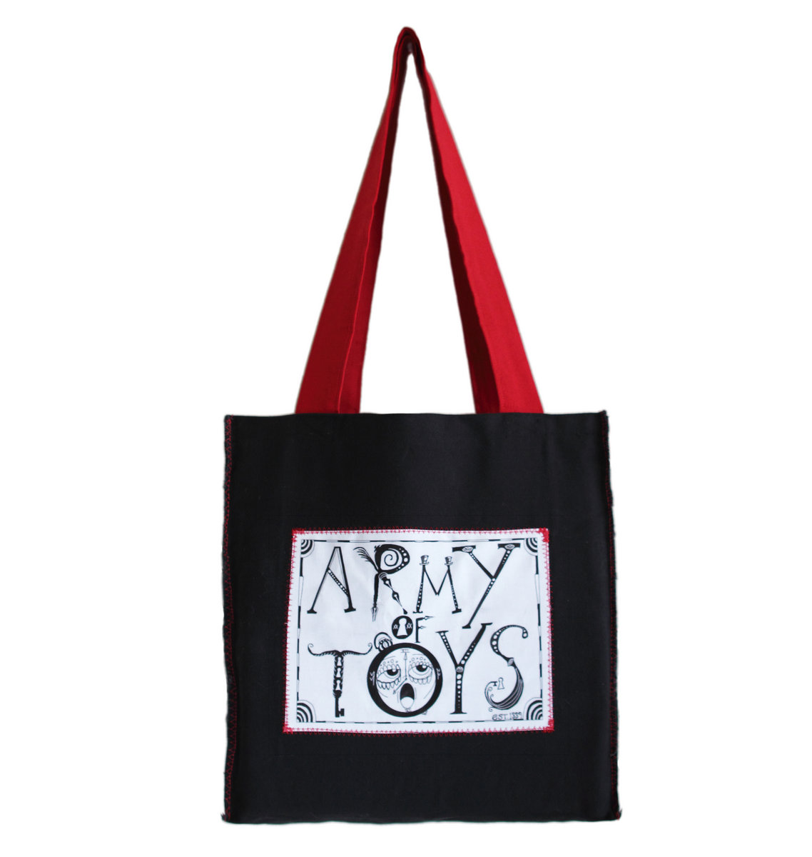 This handmade tote is by creatrix/seamstress Jackie Olivia and features the art of Walter Sickert. A steam-crunk way to carry everything you need to run away with the Pornival-- we mean, follow the Illuminati circus out of town-- we mean... enjoy these bags, fill them with art, and go on adventures. They are made of sturdy black cotton twill with tentacle-red vibrant handles and red contrast stitching.