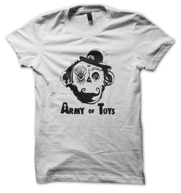 Viddy well, I daresay you'll be in the height of fashion, ready for the ol' milk bar lurk in this **unisex white tee**. It features your favourite wind-up monkey droog from Walter Sickert's Chimpwork Orange. Silk-screened in blackest of ink. And know that you'll receive a marvelous inkdripped ART card from the WIREFOREST with purchase. (No time for the ol' squid and out!)
